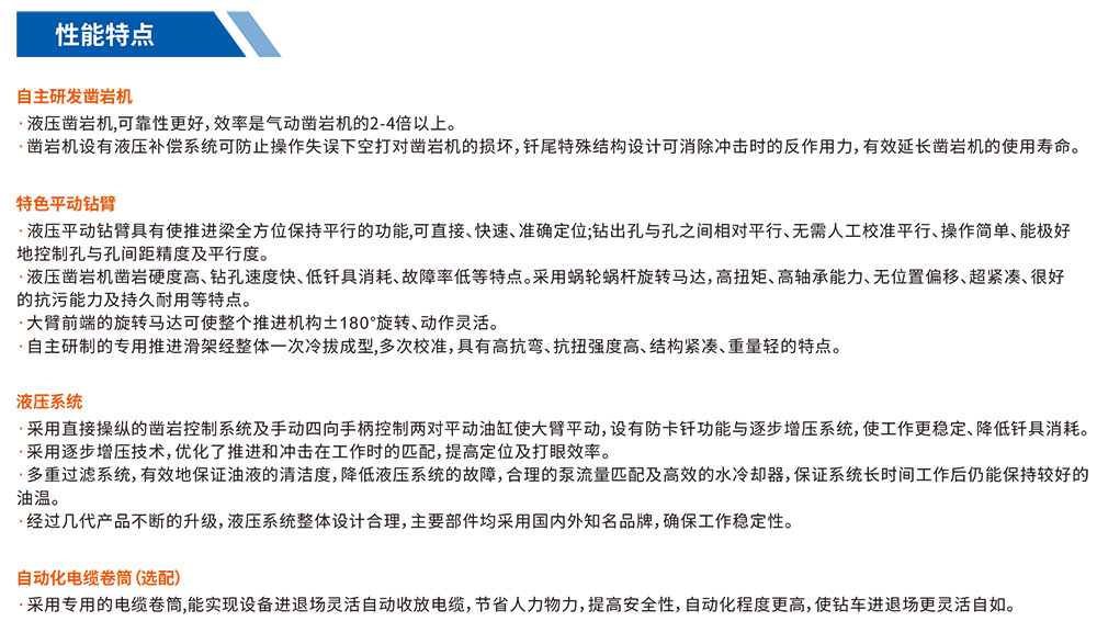 CMJ1-14全液壓鉆車:主要用于煤礦的巖巷掘進(jìn)。該機(jī)機(jī)身小,結(jié)構(gòu)緊湊,適合在中小斷面巷道中作業(yè),鉆孔直徑Ф43mm。巷道斷面4.3m(寬)x3.5m(高)以下的巖石巷道中作業(yè)。該機(jī)機(jī)動靈活,鑿巖速度快,工作效率高;液壓系統(tǒng)先進(jìn),維修方便;工作穩(wěn)定,爬坡能力強(qiáng),操作方便,安全可靠。該鉆車不僅適用于煤礦,而且還可以用于冶金、建材、化工、水電、鐵路等部門的巷道、隧道、涵洞的掘進(jìn)工程,適用面廣,是當(dāng)前我國工程建設(shè)中一種先進(jìn)的鑿巖設(shè)備。