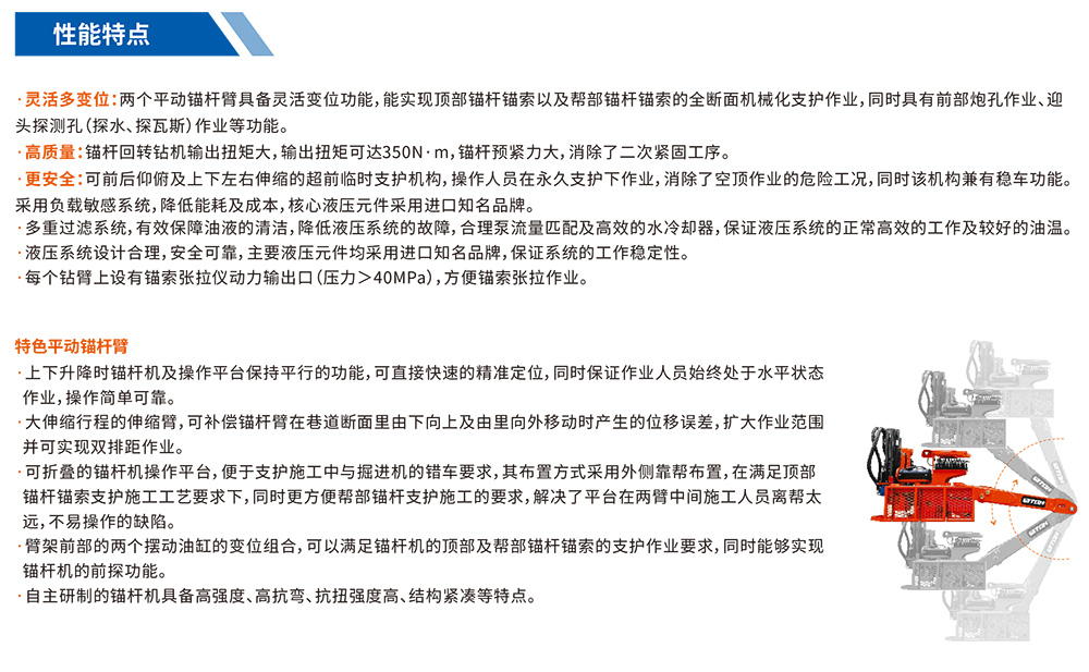 煤礦用液壓兩臂錨桿鉆車是一款新型巷道支護機械設(shè)備該機與掘進機、鉆裝機組配套使用,能快速完成支護工作實現(xiàn)作業(yè)平衡,高效機械化。主要適用于煤巖和半煤巖巷道工作面的支護作業(yè),能夠同時實現(xiàn)巷道頂部和側(cè)幫錨桿錨索支護,還具有煤層內(nèi)鉆炮孔及探測孔(探水、探瓦斯)等功能。