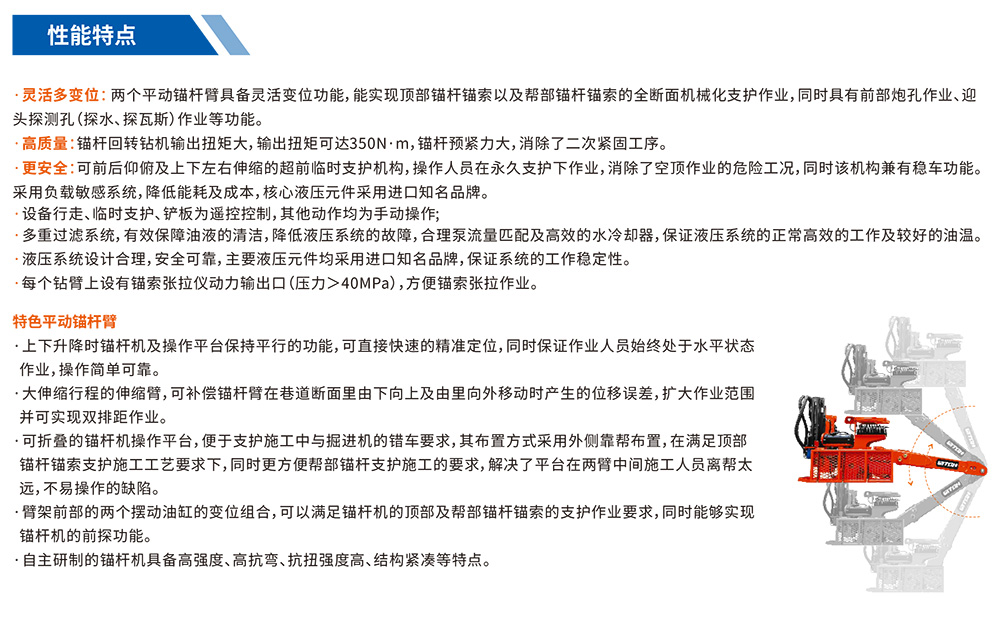 一款窄型巷道支護(hù)機(jī)械設(shè)備,該機(jī)與掘進(jìn)機(jī)、鉆裝機(jī)組配套使用,能快速完成支護(hù)工作,實(shí)現(xiàn)作業(yè)平衡,高效機(jī)械化。主要適用于煤巖和半煤巖巷道工作面的支護(hù)作業(yè),能夠同時(shí)實(shí)現(xiàn)巷道頂部和側(cè)幫錨桿錨索支護(hù),還具有煤層內(nèi)鉆炮孔,及探測(cè)孔,(探水、探瓦斯)等功能。