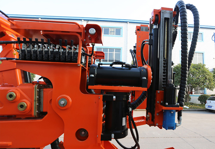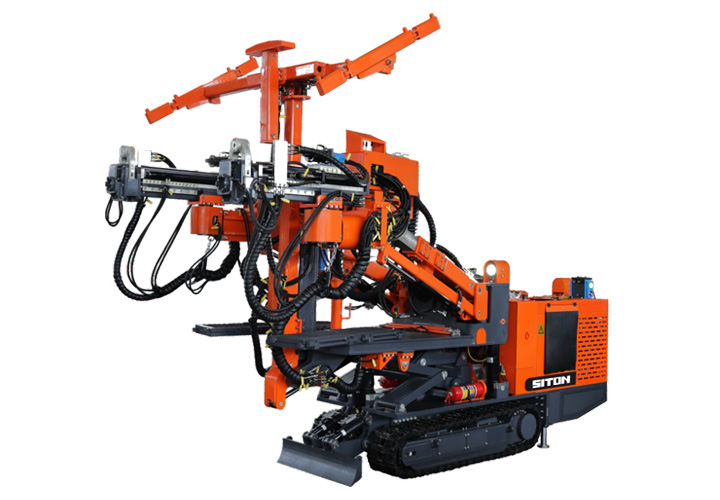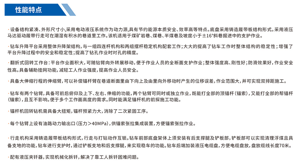 煤礦用液壓錨桿鉆車是我公司對掘進(jìn)工作面高度范圍3.5~4.8米的巷道而設(shè)計的,并且在結(jié)構(gòu)和功能上采用了整體升降的工作平臺,可以根據(jù)巷道高度情況通過平臺升降使作業(yè)人員進(jìn)行上下調(diào)整,從而很方便地實(shí)現(xiàn)巷道內(nèi)不同高度、不同角度錨桿錨索孔、炮眼孔、探測(探水、探瓦斯)孔的機(jī)械化作業(yè)施工。該設(shè)備具有鉆進(jìn)功能全面、安全性好、工作效率高、工人勞動強(qiáng)度低等特點(diǎn),尤其是工人在使用其進(jìn)行錨桿錨索支護(hù)作業(yè)時能大大縮短支護(hù)作業(yè)時間,提高支護(hù)效率和支護(hù)質(zhì)量。該設(shè)備結(jié)構(gòu)合理、機(jī)構(gòu)緊湊、運(yùn)轉(zhuǎn)靈活、操作方便,是實(shí)現(xiàn)目前國內(nèi)巷道掘進(jìn)支護(hù)快速。高效、機(jī)械化的首選裝備。