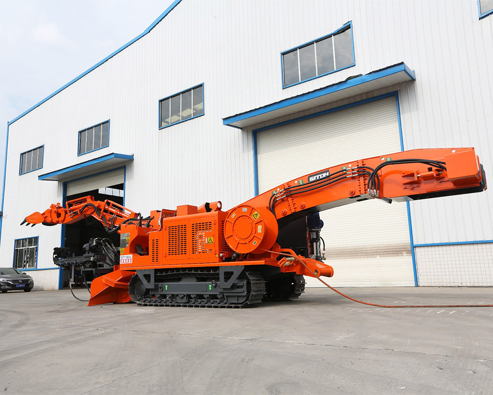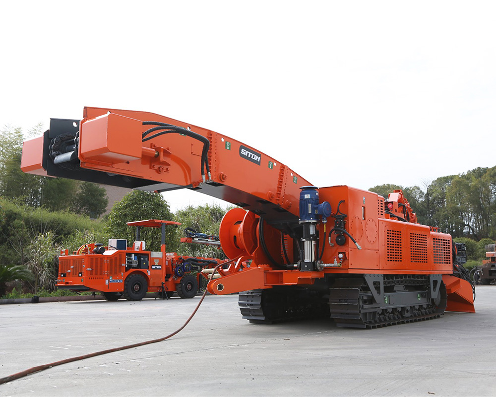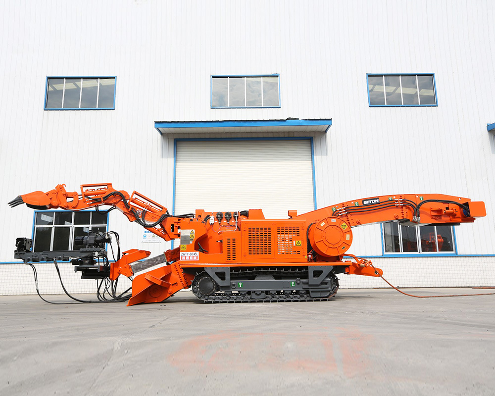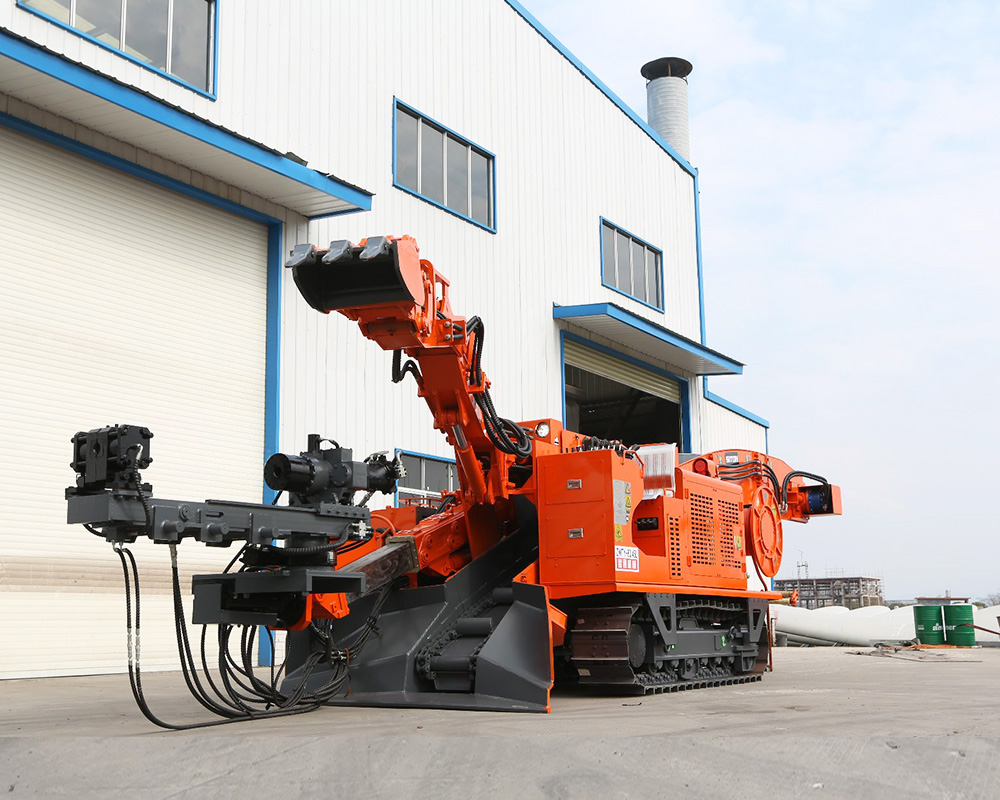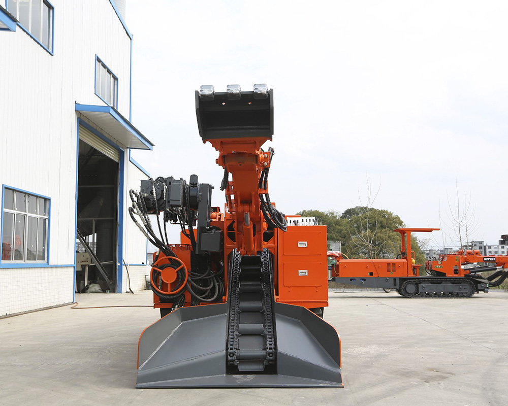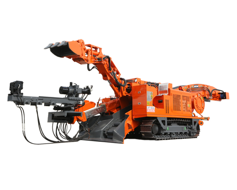 CZWTY-80煤礦用挖裝探機組是一種集裝載、鉆探兩種功能于一體的作業(yè)裝備。用于礦山巖巷、引水洞以及其它工程巷道中的掘進作業(yè)。其應用提高了掘進速度,降低了工人的勞動強度,掘進施工作業(yè)提高了安全,很好的實現(xiàn)了巖巷掘進的機械化作業(yè)需求。同時解決了中小巷道多種設(shè)備錯不開車的問題。挖裝探機組鉆臂可對巷道迎頭工作面鉆探測孔,也可以鉆瓦斯釋放孔。反鏟機構(gòu)扒臂扒取遠處的巖石,送入刮板運輸機,刮板運輸機從尾部將巖石卸入礦車或皮帶運輸機中,也可以用扒斗來清理工作面。