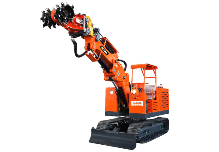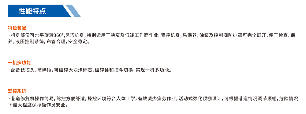 該設(shè)備上半部分可水平旋轉(zhuǎn)360°,可以滿足銑挖、挖掘、側(cè)向開口、破巖、裝車、起吊等各項動作要求;實現(xiàn)挖掘水溝、開口側(cè)巷道、破巖、清理浮煤、平整巷道及小型配件吊裝等多種功能。該開口機可配備液壓銑挖機、液壓破碎錘,破碎硬度較高的大塊巖石。煤礦用巷道修復(fù)機為模塊化設(shè)計,具有互換性,本機動力單一,整機功率僅90kw,全部動力集中在一個動力模塊;由一個電機、主泵、一聯(lián)輔泵組成。液壓系統(tǒng)采用中高壓、發(fā)熱相對較低,并配有風冷系統(tǒng),主要動作采用先導(dǎo)閥控制,操作簡便,工作平穩(wěn)無沖擊,系統(tǒng)運行穩(wěn)定可靠性高。