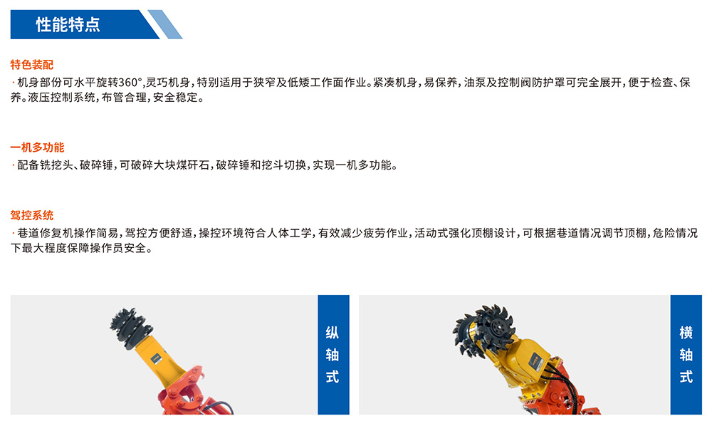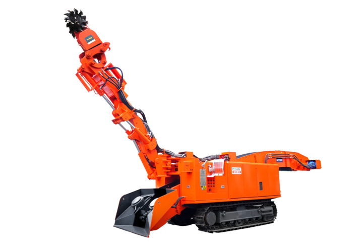 該設(shè)備是一款小型多功能機(jī),截割功率高。該機(jī)結(jié)構(gòu)緊湊、操作靈活、工作范圍大、可靠性高、便于分解下井和組裝,尤其是截割臂可以彎曲,屬國內(nèi)獨(dú)創(chuàng),具有很強(qiáng)的耙料能力??筛鶕?jù)不同的工況條件,換裝巖石破碎鍾、鏟斗,進(jìn)行巖石破碎、炮采耙料功能。既適合煤礦煤巷道的掘進(jìn),又可從事大型煤礦巷道修頂、刷幫和切底工作,特別是針對煤礦巷道?,F(xiàn)的底鼓現(xiàn)象,該機(jī)以其小巧靈活、工作范圍大、移動方便的特性,切底效率顯著,具有其它掘進(jìn)機(jī)不可比擬的優(yōu)越性。