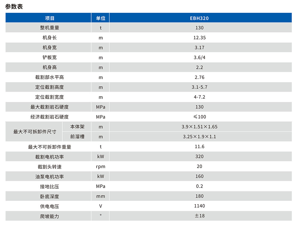 EBH320系列掘進機整機性能穩(wěn)定,機身重,重心低,布局合理,用于煤巖、半煤巖開采,適用于巖石硬度F9級以下的巷道, 該系列掘進機以安全可靠、維護便捷為理念,關鍵零部件選用國外品牌,結(jié)構配件按標準加工、制造、檢測,具有結(jié)構緊湊,操作靈活,出勤率高,服務年限長等特點,可與單軌液壓四臂錨桿臺車組成快掘系統(tǒng),。